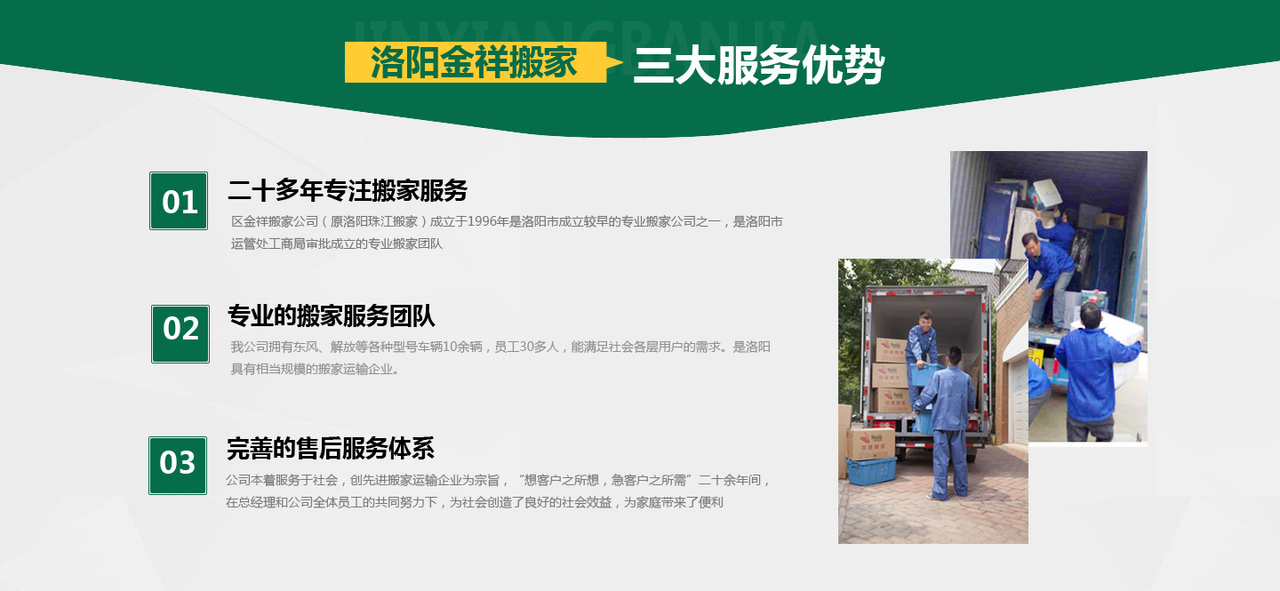 洛阳金祥搬家服务有限公司(原洛阳珠江搬家)成立于1996年是洛阳市成立较早的搬家公司之一,因发展需要公司于2008年更名为洛阳金祥搬家,是洛阳市运管处工商局审批成立的搬家团队。公司位于九都路与涧东路交叉口向东100米路南(外国语学校斜对面),地理位置优越,可快速的服务全市,我公司拥有东风、解放等各种型号车辆10余辆,员工30多人,能满足社会各层用户的需求。是洛阳具有相当规模的搬家运输企业。